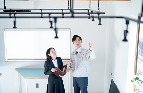 電気設備工事、空調設備(エアコン取付等)、防犯設備(防犯カメラ、インターホン等)、消防設備、家電機器(IH、テレビ、LED、照明器具等)、共聴設備工事(同軸配線等)、デジタルサイネージ等放送設備、省エネ節電化機器(電力見える化端末)、戸建住宅用設備、マンション設備、オフィスビル設備など
